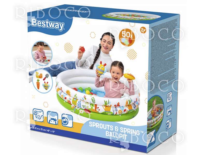 Bestway Sprouts & Spring е създаден за деца над 2 години и комбинира интерактивна игра с развитие на умения. Комплектът включва 46 цветни топки и 4 изненадващи отварящи се топки, в които се крият фигурки Puffy Pals с градинска тематика.